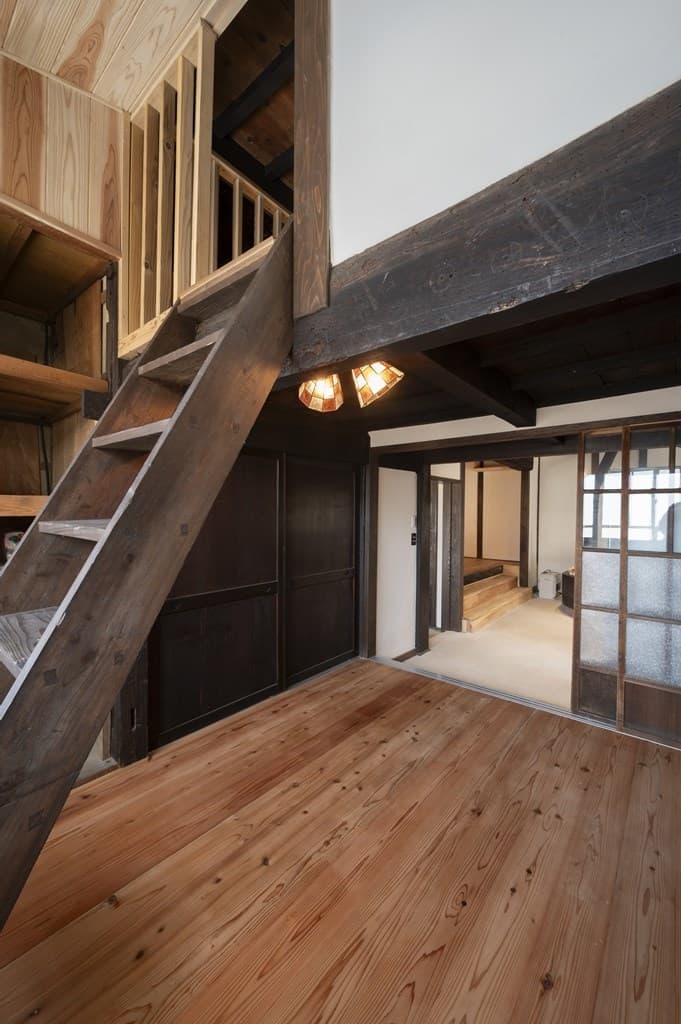 内装は昔ながらの土壁を塗り直し、地元の杉材を使った床や羽目板を採用。建具は当時のものをリペアし、役割や配置を工夫しながら再利用することで、古民家の魅力を引き立てました。