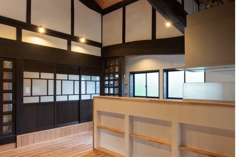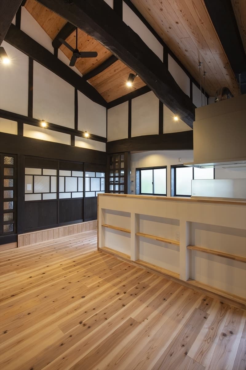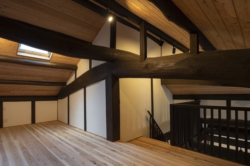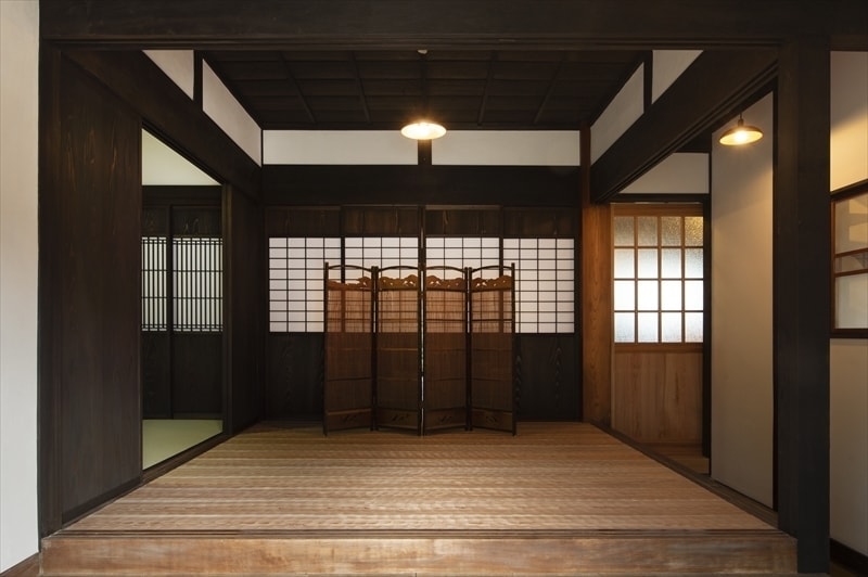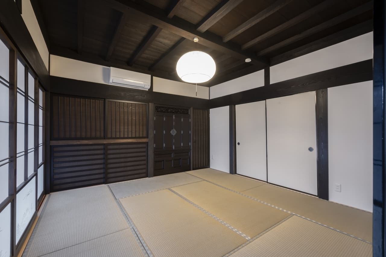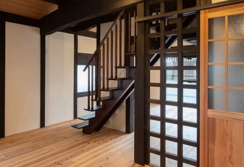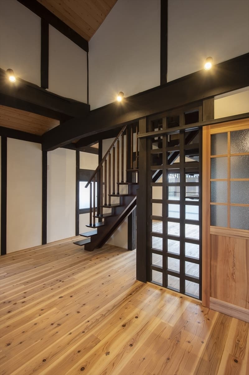 伝統的な内装を活かしつつ、格子パネルや壁の内側ダンパーで耐震性を高めています。