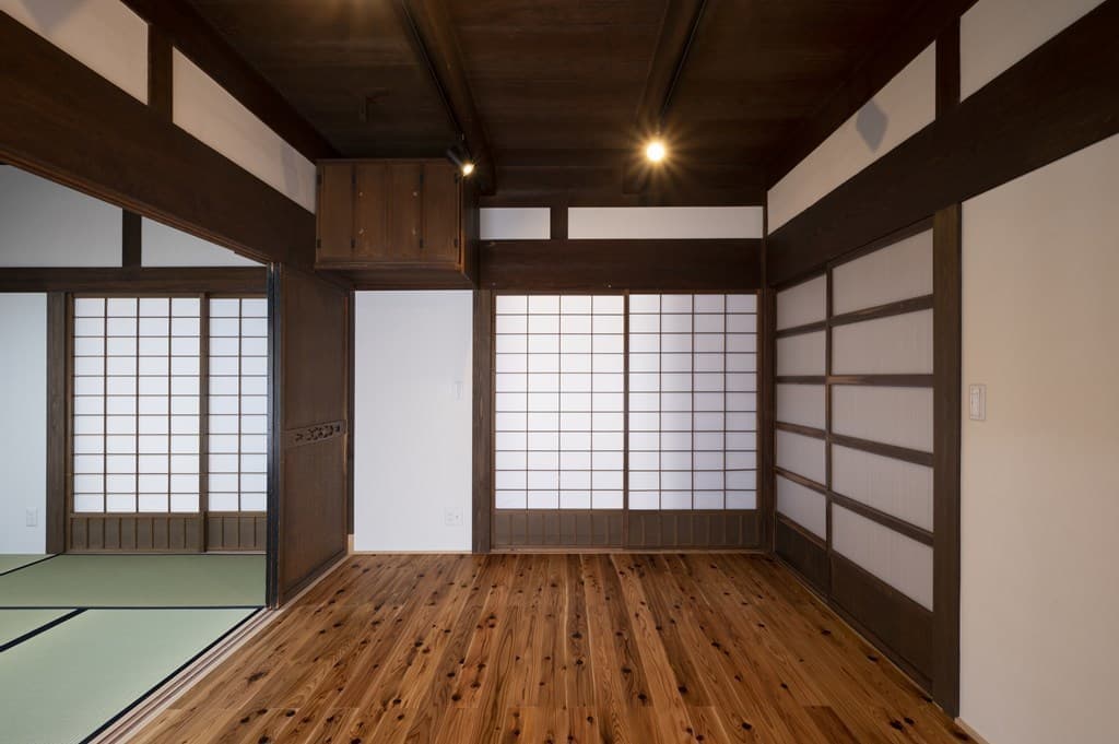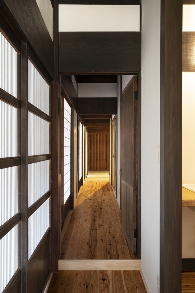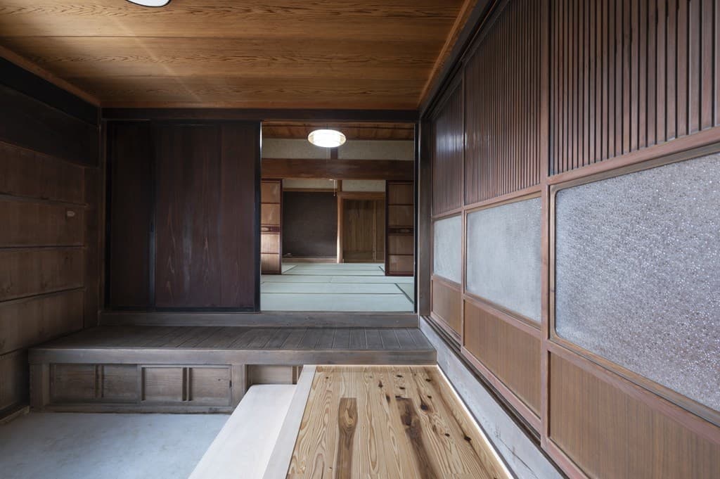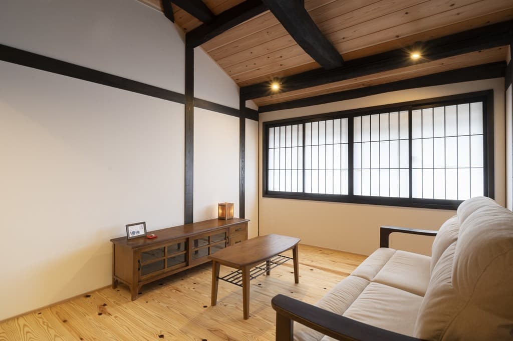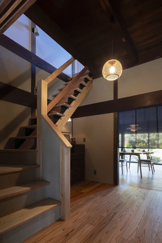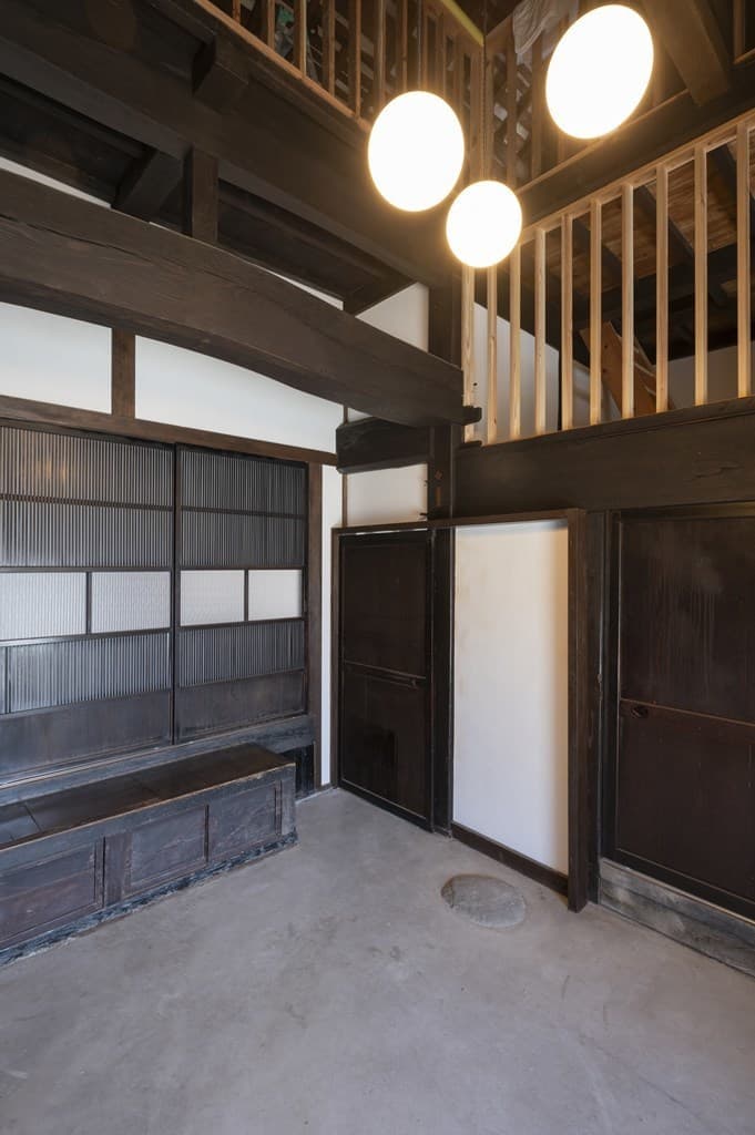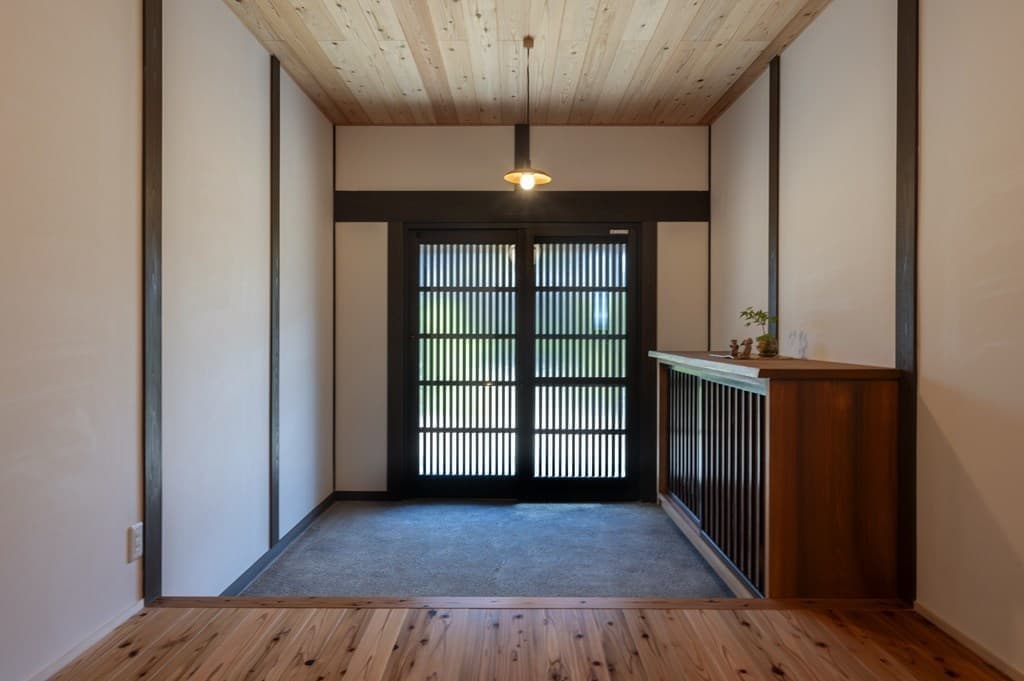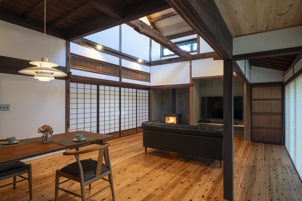 内装は昔ながらの土壁を塗り直し、地元の杉材を使った床や羽目板を採用。建具は当時のものをリペアし、役割や配置を工夫しながら再利用することで、古民家の魅力を引き立てました。