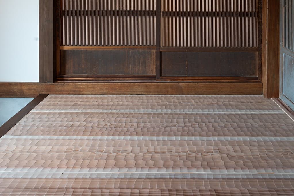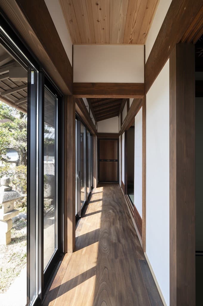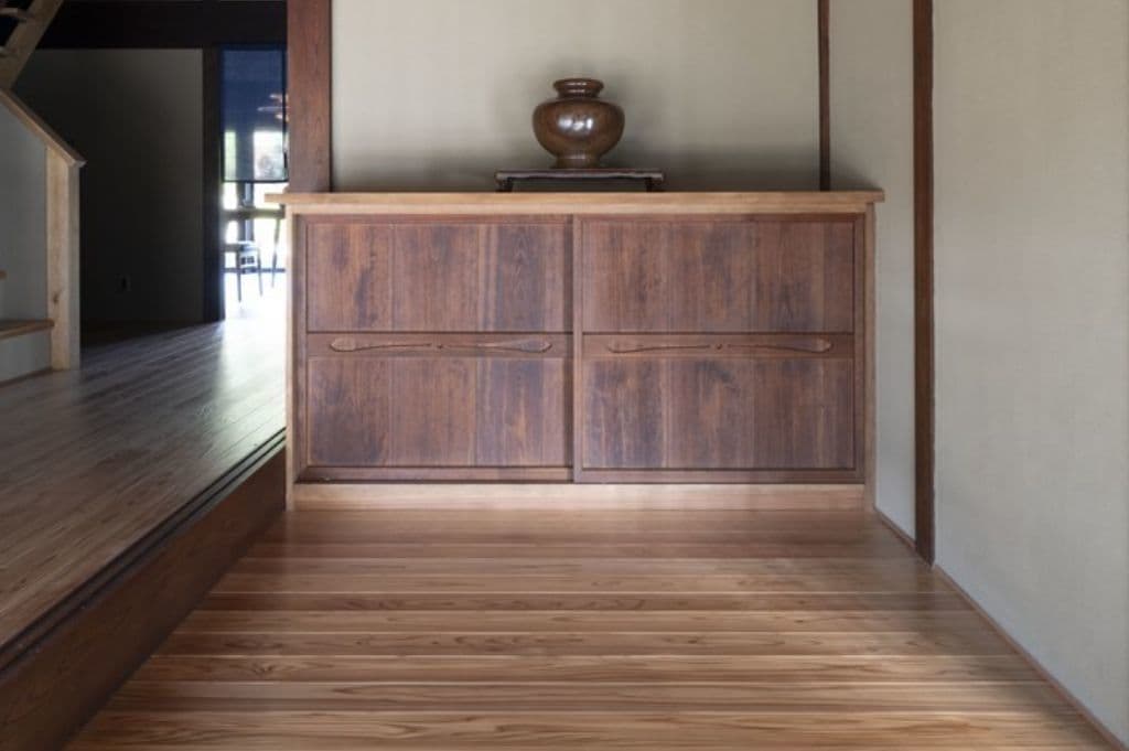縁側に使用されている欅(けやき)は8mの一枚板で、元は解体した離れの廊下に使われていたものを再利用しました。こうした素晴らしい素材は古民家再生の際、積極的に活用することをおすすめしております。