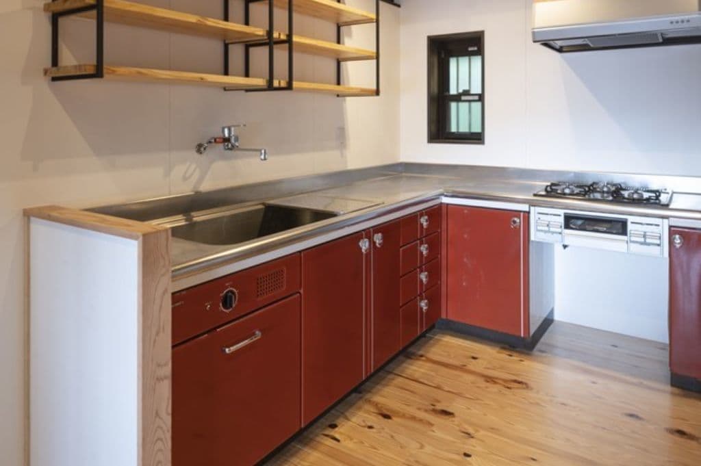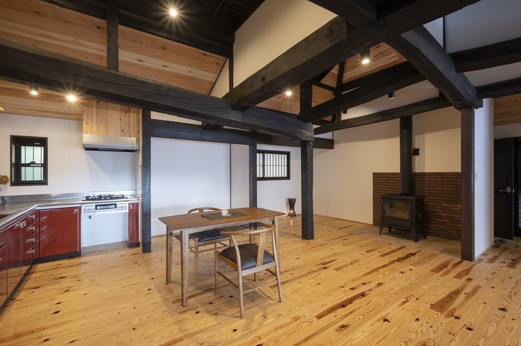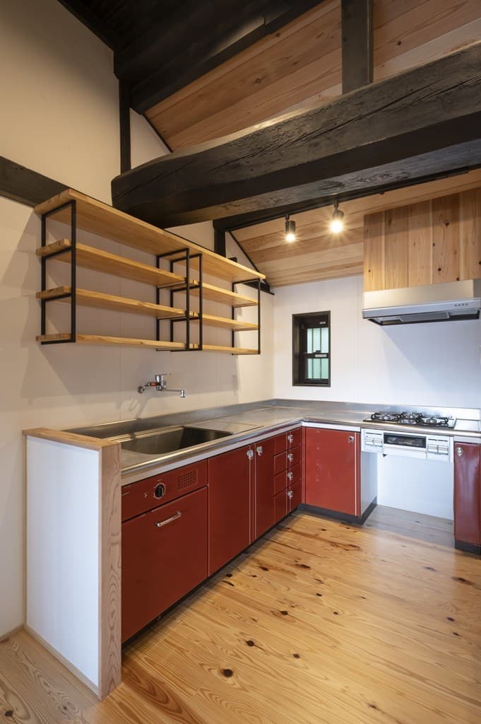 おおよそ築100年と思われる古民家。茅葺きの屋根、土間の上にあった煤竹天井、壁などはそのままに、建具類は再塗装、調整をして使っています。レトロなキッチンは施主様自ら磨き大切に使われることとなりました。