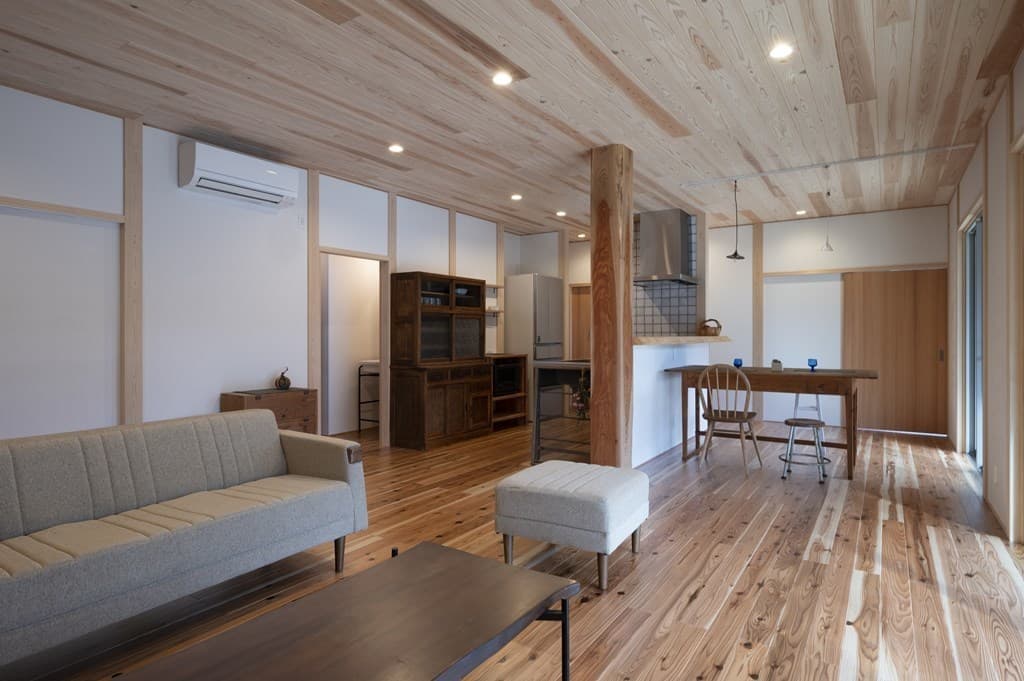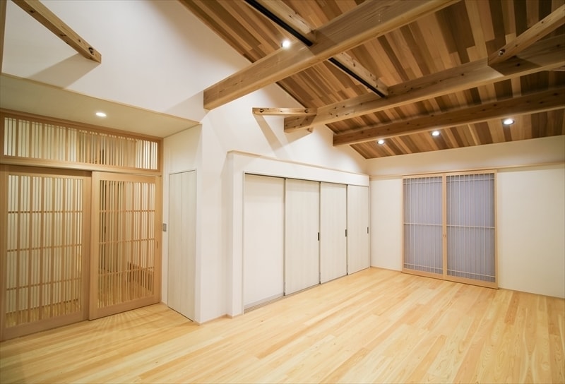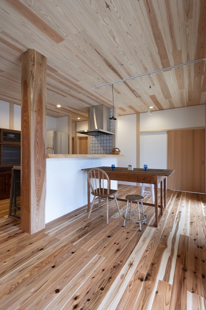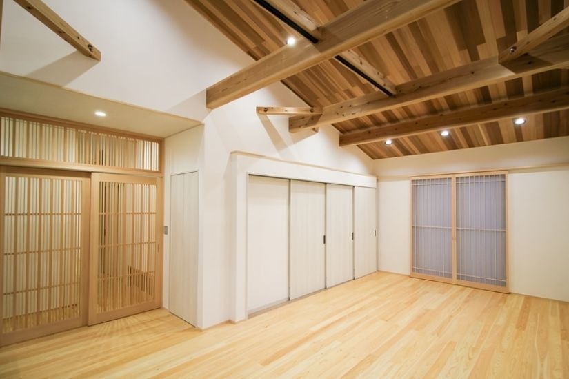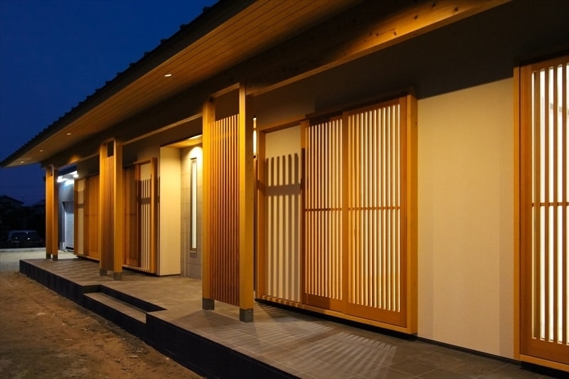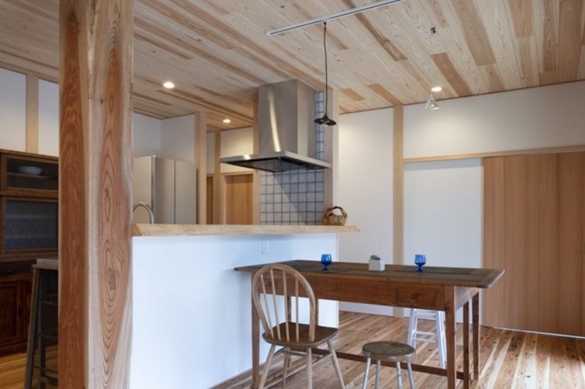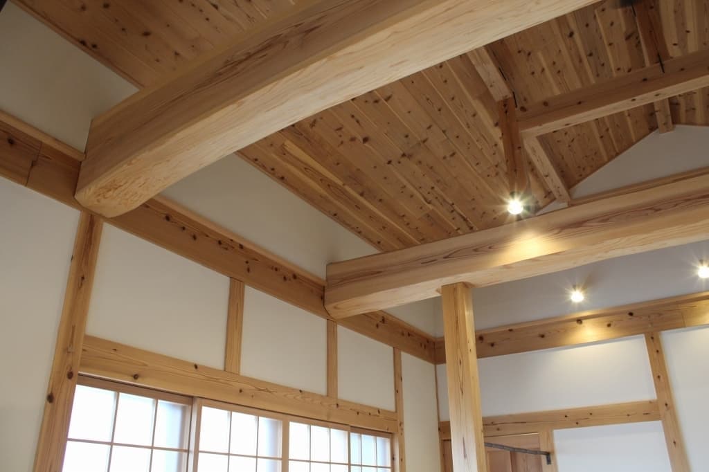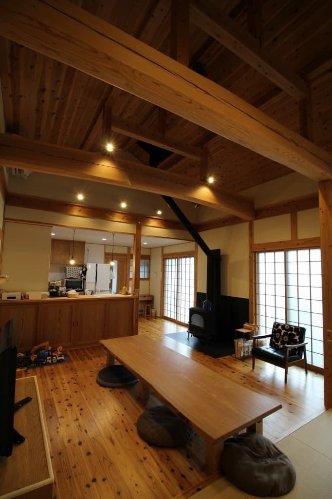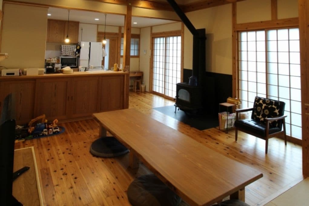 NEW HOUSE 新築住宅施工例 『住宅施工物件 NO.1』 古民家がお好きな施主様の意向で、大黒柱や建具などは古民家から移設利用しております。和風建築の多い田舎の集落の雰囲気に合わせた外観をご希望とのことでしたので、珍しい黒いぶしの和瓦で施工しています。 趣味のスペースとして通り土間を広くお取り致しました。たっぷりとした収納を備えたことで空間を広々とお使い頂ける物件です。三重県の木を主に使った住まいは、三重の森の循環にも繋がっております。 『住宅施工物件 NO.2』 古民家風の新築住宅をお造りしました。室内は木をふんだんに使い温もり溢れる住宅となっております。全面の格子戸から漏れる照明、家に帰ってきた時ほっとする柔らかな明かりが特徴的です。 『住宅施工物件 NO.3』 大きな窓、玄関から吹き抜ける風が家全体を通る、とても気持ちの良いお住まいが完成しました。壁、天井、床全てに木を使った温かな住まい。大きくとった玄関トーチで雨の日の出入りも濡れることがありません。 『住宅施工物件 NO.4』 贅沢に木を使ったお住まいが完成しました。柱として整えた梁ではなく、木そのものの湾曲を生かした形状、随所に感じられる自然な木の木目、節。各種建具は桧の一枚板でお作りしています。 『住宅施工物件 NO.5』 山路工務店取締役顧問自宅。主婦の目線で動線を配置しました。キッチン横のステンドグラスが優しい色合いを演出します。足元が冷えやすいキッチンにペレットストーブを配置。家族が集まるリビングは床暖房を完備し、冬でも暖かいお住まいとなっております。